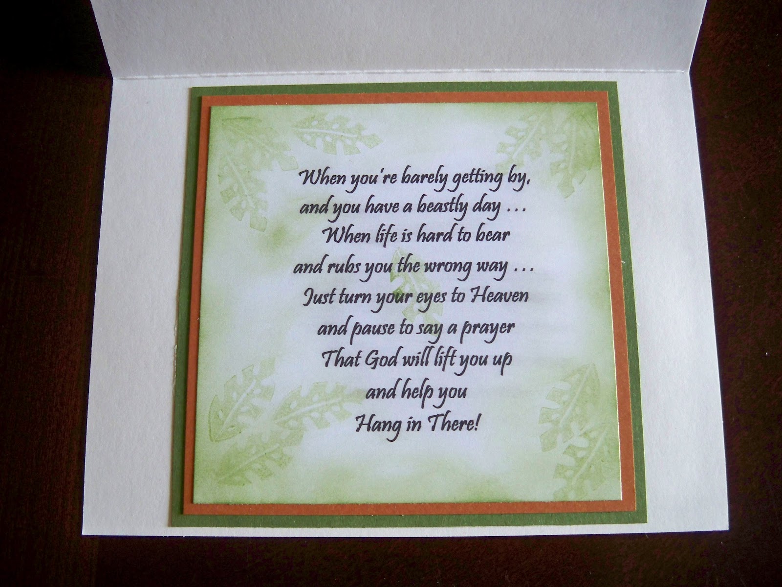 The sentiment and inside verse is from my computer. I inked the image and the inside mats with Memento's Bamboo Leaves ink. I used the same ink to stamp the leaves on the inside of the card.